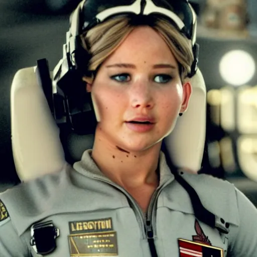 still of Jennifer Lawrence as female Maverick in remake of Top Gun (2029)