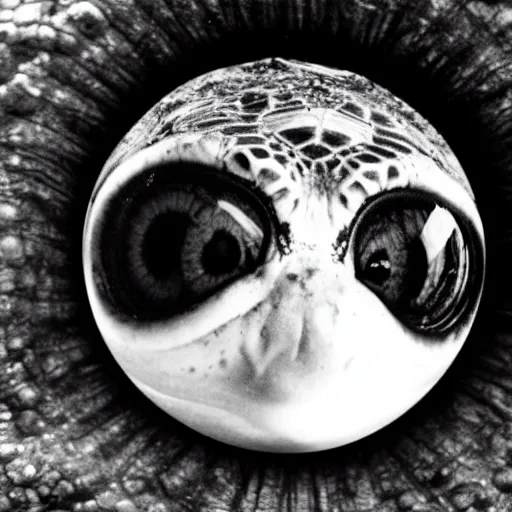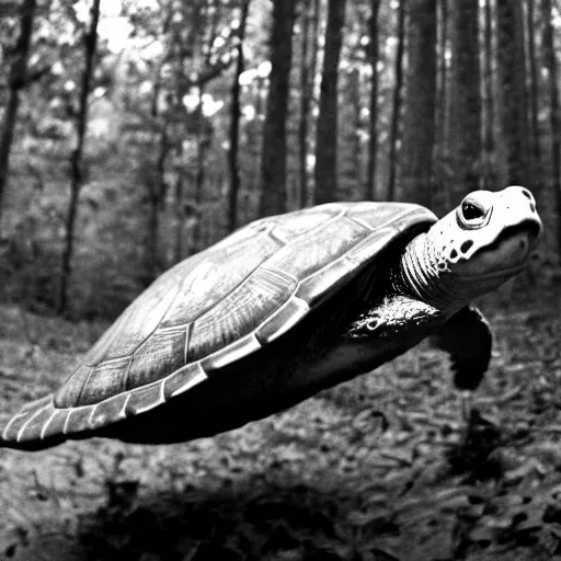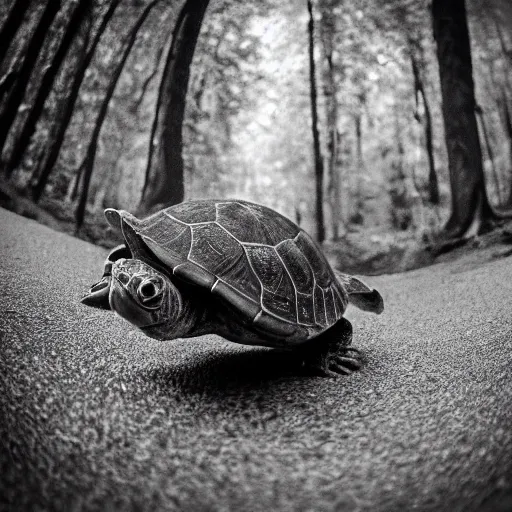 fish eye footage of a skinwalker turtle with human face in the forest, black and white