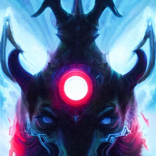 portrait of an evil goat man as a paladin in full shining armor with one beautiful red glowing ey...Show more