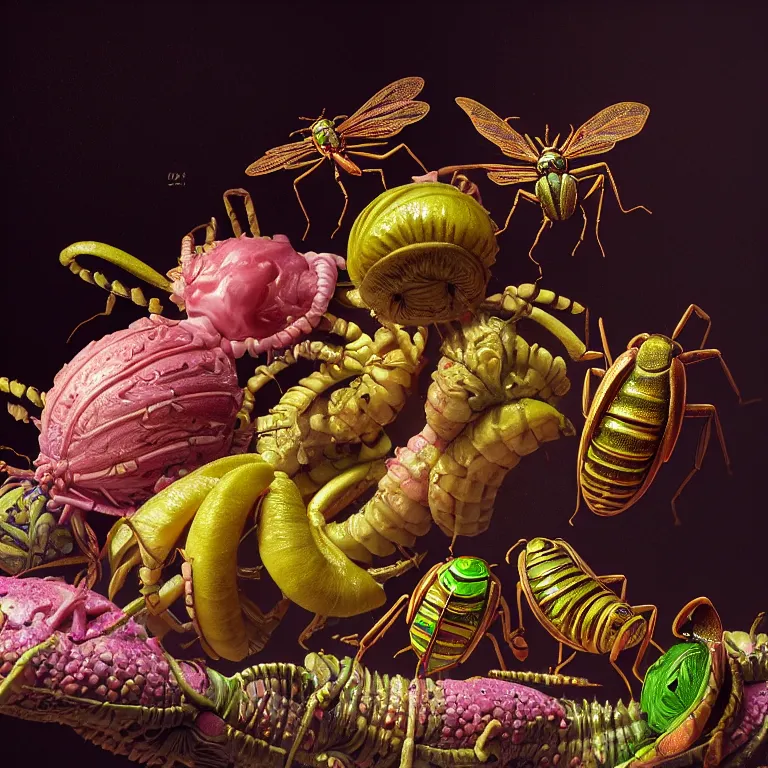 still life surreal alien insects, alien insect, surreal alien ribbed pastel tropical flowers, rot...Show more