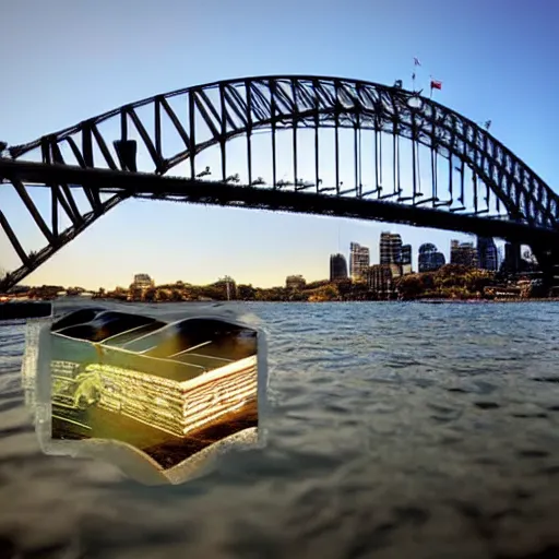 an award winning photo of a printer cartilage floating in the Sydney harbor bridge-n 4