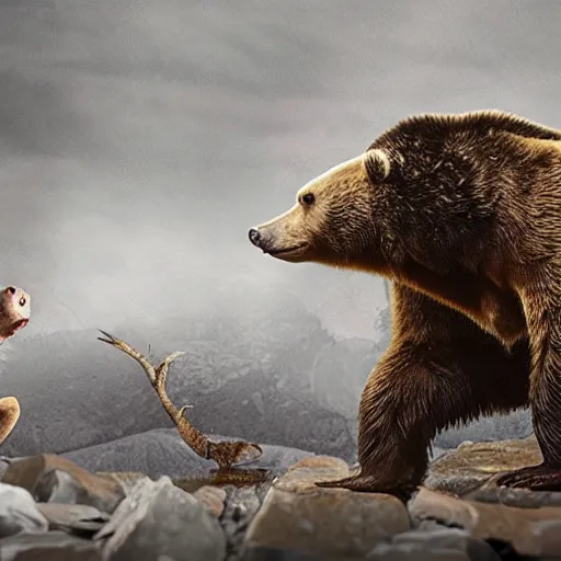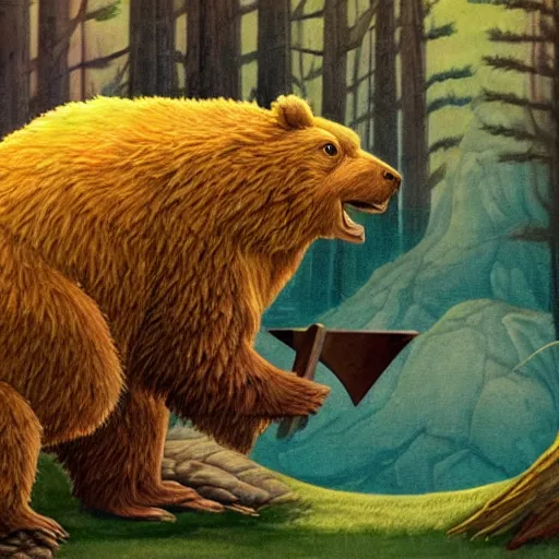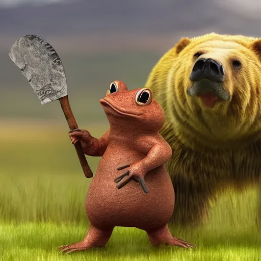 the character Toad chasing a grizzly bear with an axe