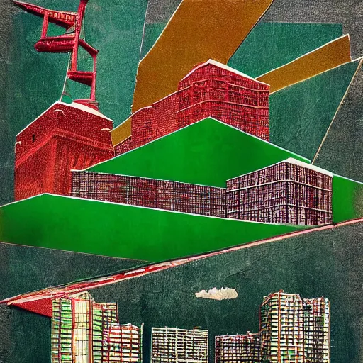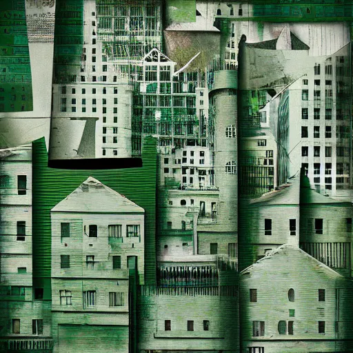 collage style Joseba Elorza, Journalic paper texture buildings, papercut, pop-art, background green color