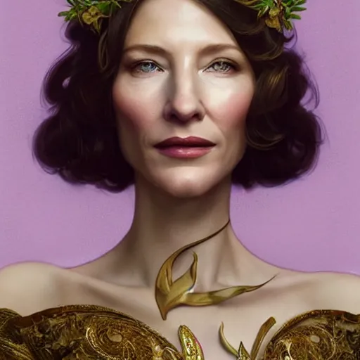 Portrait of cate blanchett wearing a floral crown, olive skin, long dark hair, beautiful bone str...Show more