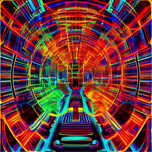 Prompt: intricate maze of rainbow-colored circuitry that extends into the distance. volumetric light , Highly detailed perfectly symmetrical , PBR , high detail,8k resolution , hyper quality , high resolution , hyper quality , high resolution , Octane render , IMAX 3D