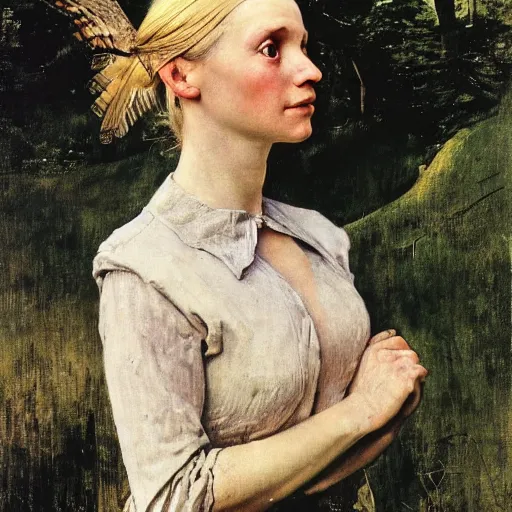 a portrait of a blonde woman with pigtails, she has a barn owl perched on her forearm, by Andrew Wyeth, Ivan Shishkin, Norman Rockwell