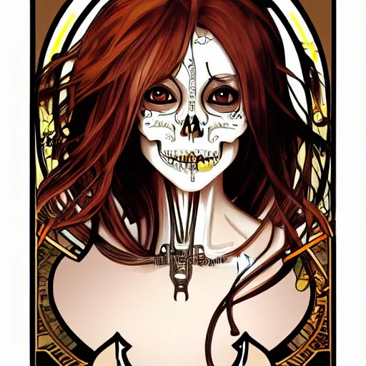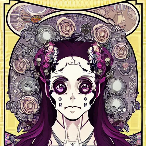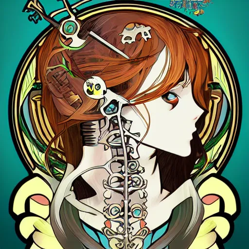 anime manga skull portrait girl female cyborg skeleton profile illustration style by Alphonse Mucha pop art nouveau