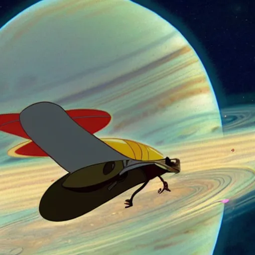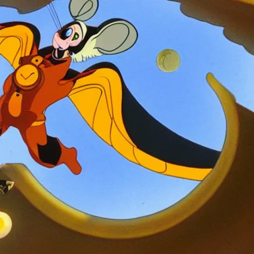 a mouse with clockwork wings flying past Jupiter, Don Bluth