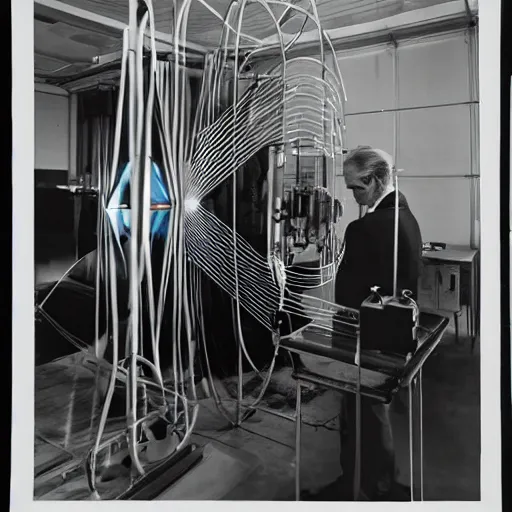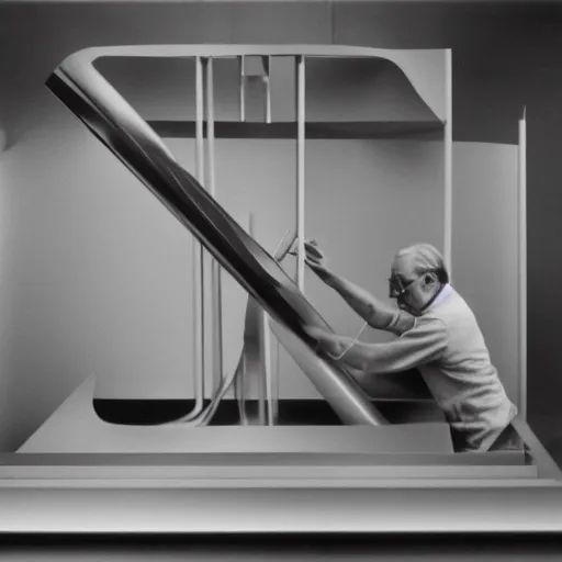 filmstill of Marcel Duchamp working on a futuristic machine, long exposure, minimal packshot, archival pigment print