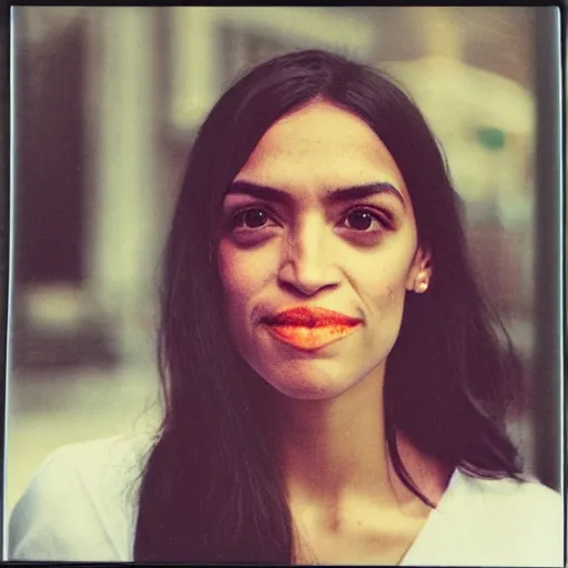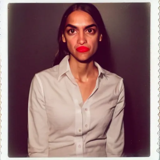 prettified Alexandria Ocasio-Cortez looking earnestly into the camera, polaroid.