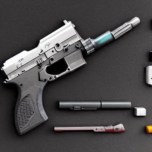 An armory of sci-fi weapons and gadgets, hyper realistic, cyberpunk, high quality, award winning, digital art