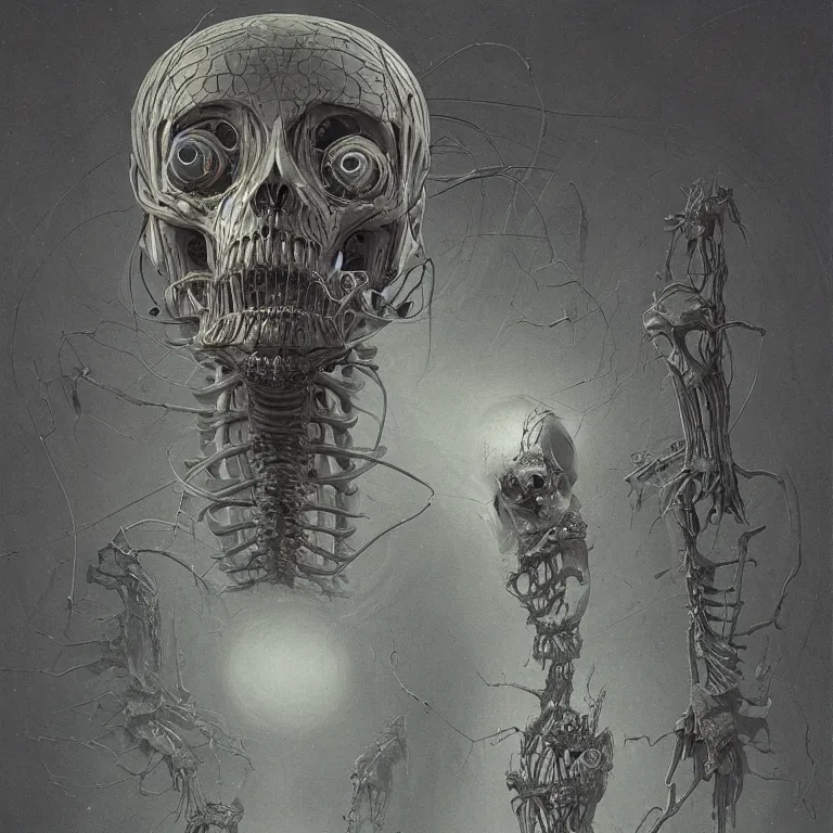 organic cyborg alien skeleton alien centipede planet face style of zdzislaw beksinski surrealism poster art album cover contrast skull eyeballs simple background