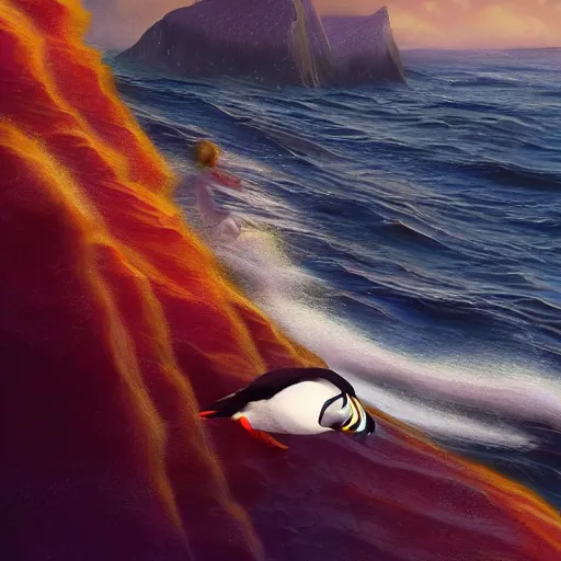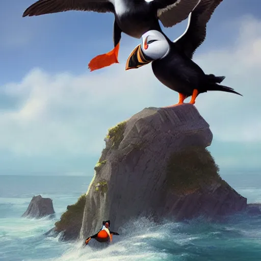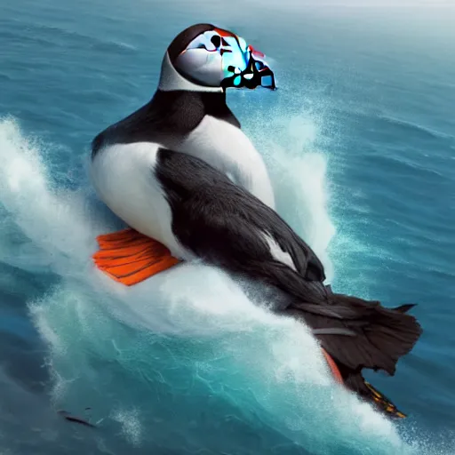 puffin surfing, cinematic, cinematic lighting, trending on Artstation, Cgsociety, detailed, 4k, very realistic