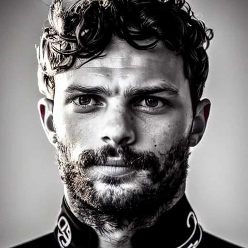 Jamie Dornan in a motorcycle biker costume, highly detailed, detailed face, cinematic, professional photograp