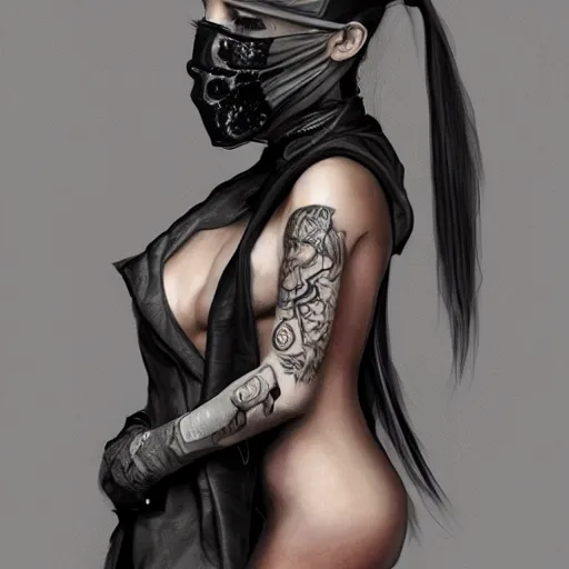 Hot young woman, grey skin, tattoos, wearing leather and cuddling a humanoid in shroud and mask concept art
