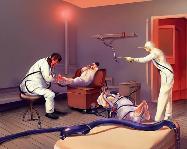 extremely greasy doctor slathering snake oil all over a patient's broken foot. It will surely be...Show more