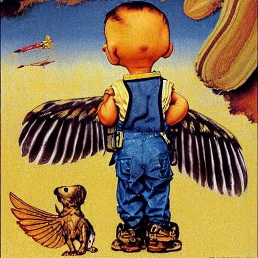peanuts with wings traveling to Saturn, painted by Norman Rockwell