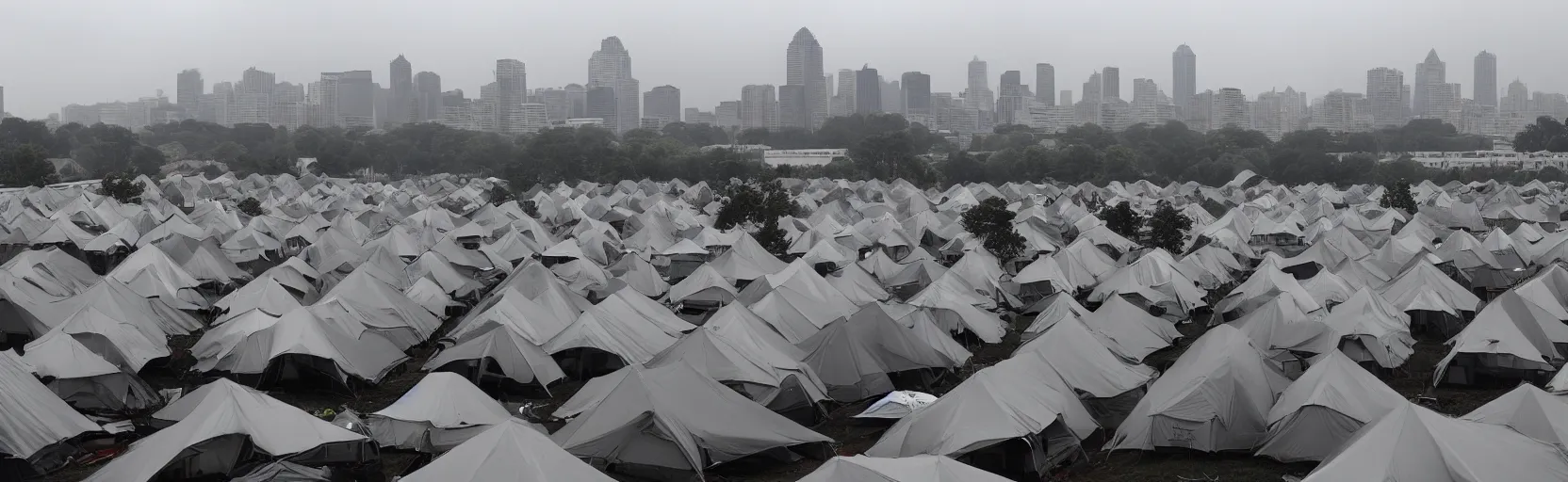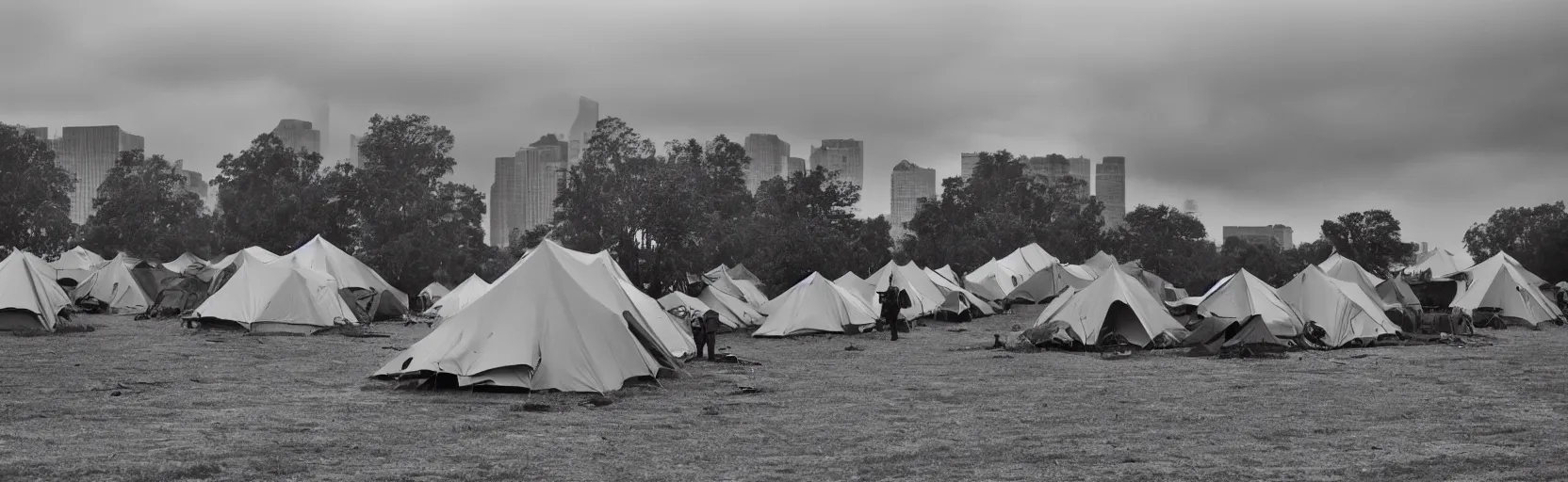 cloudy, grey skies, american knights, tent camp in foreground, fortress city of office buildings in background upon hill