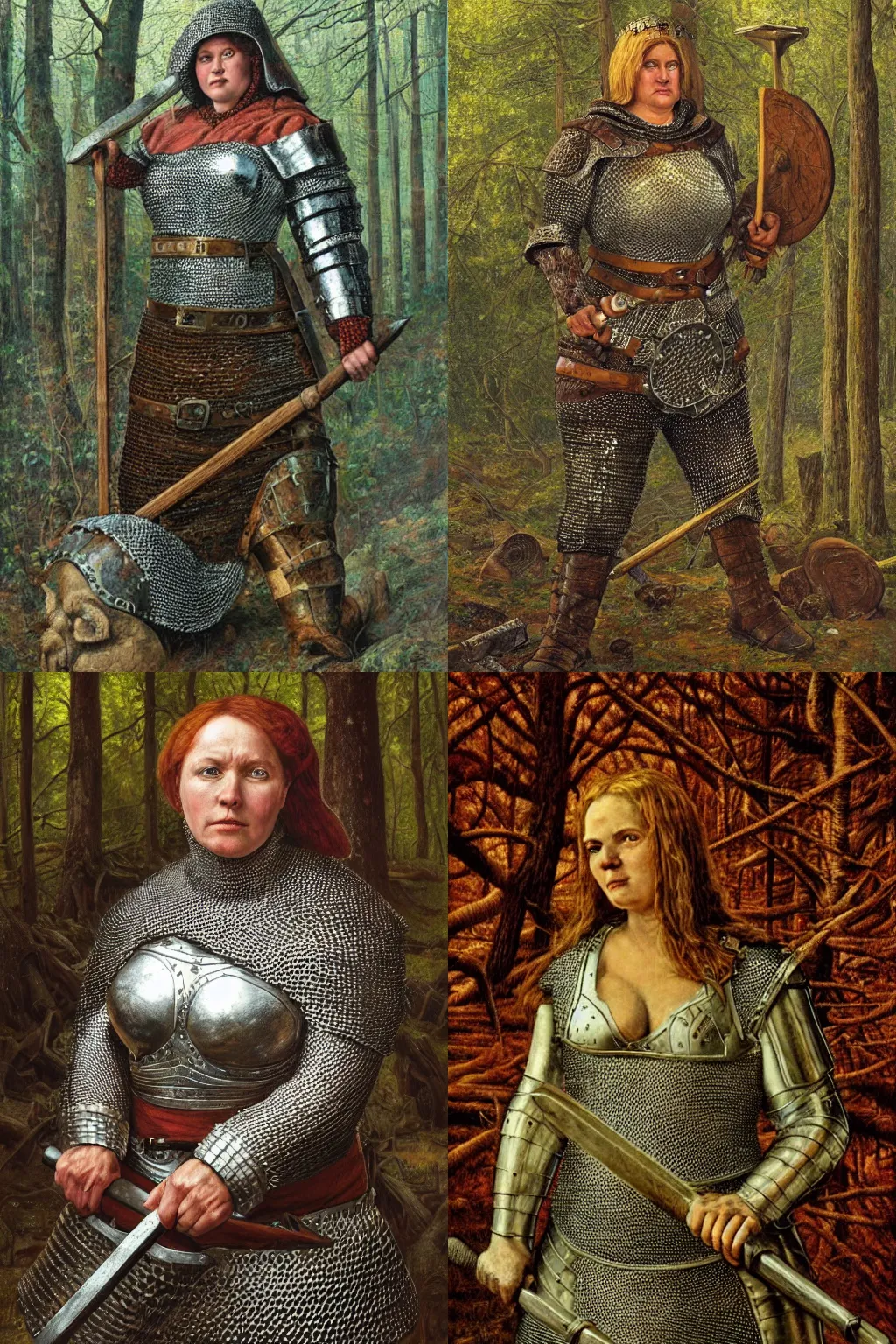 portrait | large and strong medieval woman wearing chainmail armor and a heavy hammer | style of johfra bosschart | in the forest | cgsociety |