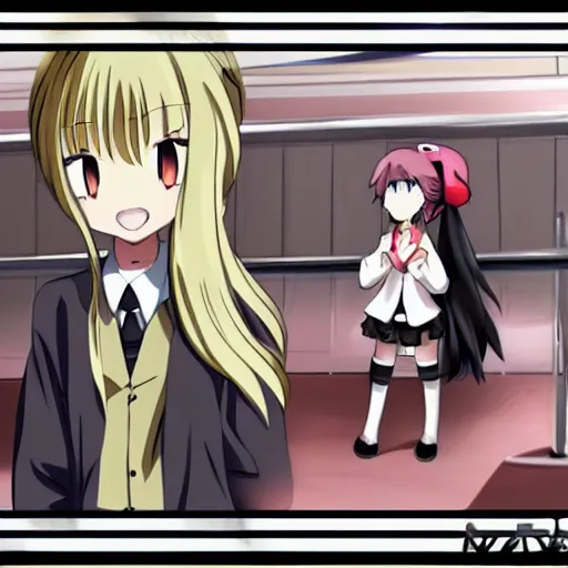 Prompt: cute anime girl bribing the district attorney. Key Frame, still from tv anime, Kyoto animation studio, imposing, threatening