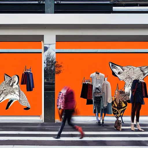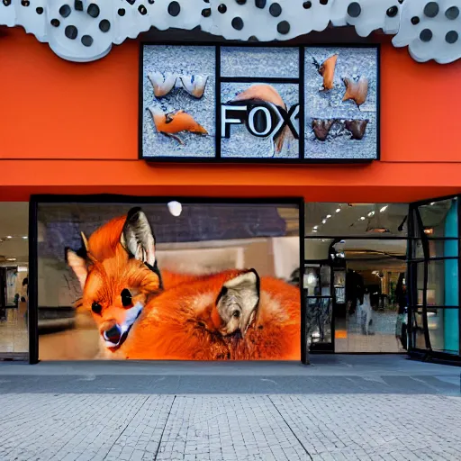 a shopping mall picture outside of a fox-themed clothing store vendor, designed after foxes, Fox design patterns on the orange wall, realistic photo