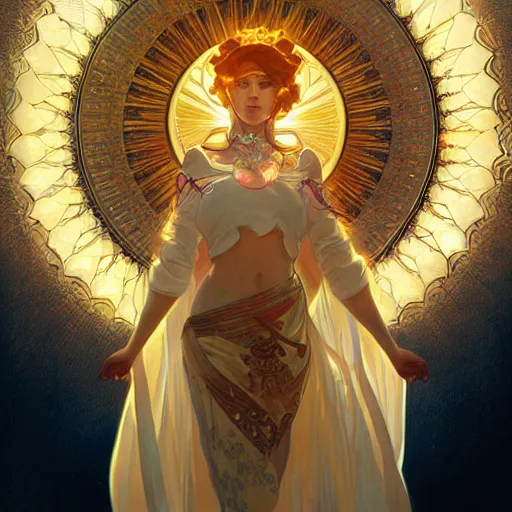 sun goddess, surrounded by light, artstation, highly detailed, elegant, by artgerm and greg rutkowski and alphonse mucha