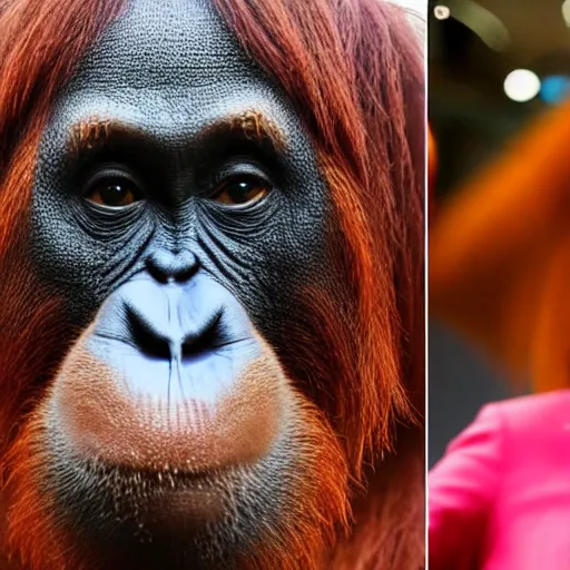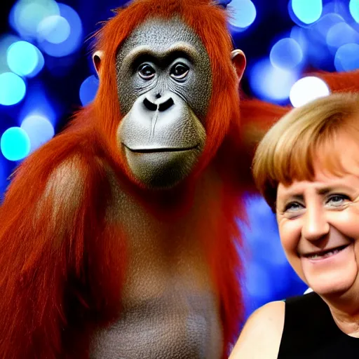 Aphoto of an orangutan taking a selfie with Angela Merkel at the club, disco lights, bokeh, hyperdetailed