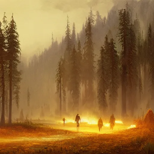 dark scary misty landscape with detailed people running away, moonshine,fire, lush field, forest, river, matte painting, by Isaac Levitan and Asher Brown Durand, Greg Rutkowski