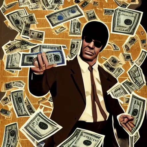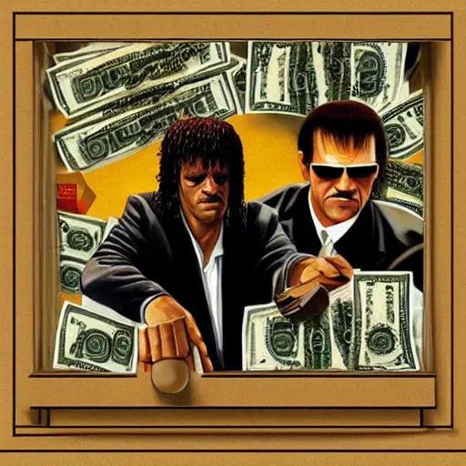 money dollar stacks in cardboard box. criminal, mafia, cigars. pulp fiction movie. photorealistic. epic composition. highly detailed.
