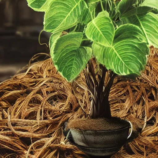 hair made of leaves human head in the porcelain pot, Harry Potter, roots, herbology, on the table...Show more