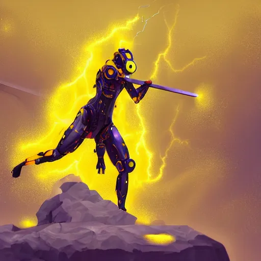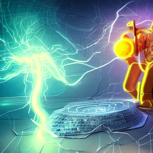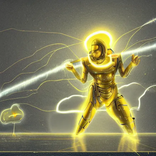 ethereal god of artificial intelligence in the shape of yellow nebulous thunder creating the firs...Show more