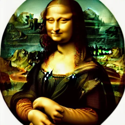 An ultra HD photo of Leonardo Da Vinci painting the Mona Lisa on an ezel, Mona Lisa is posing on a chair in front of the hills, Leonardo is painting in front of her. 1/2/1797, Wideangle, 8k