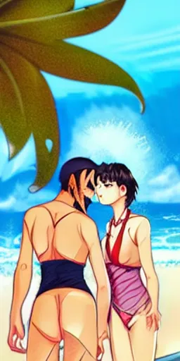 leon kuwata and sayaka maizono from danganronpa in swimsuits, 2 people, leon kuwata with an open...Show more