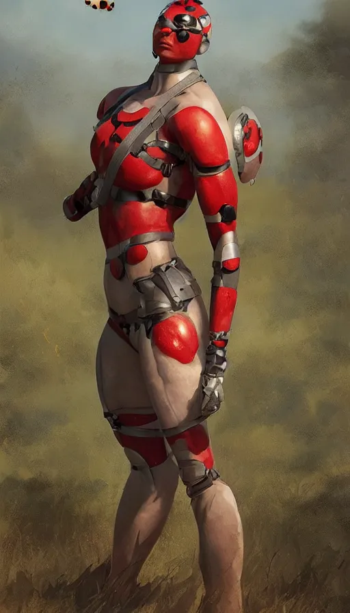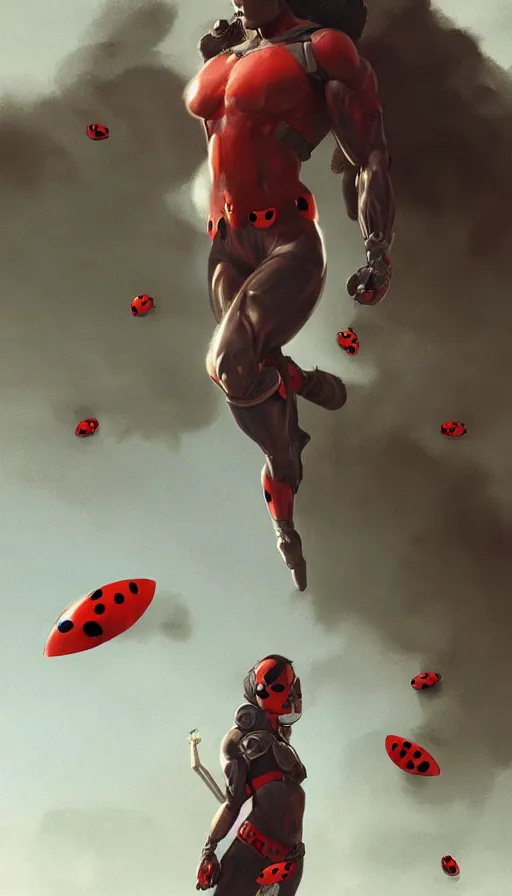 muscular humanoid ladybug character, half ladybug half human, cinematic hero shot, sunny field, epic character portrait, character art by Greg Rutkowski