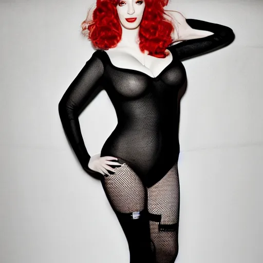 christina hendricks in body suit (teddy), thigh highs, high heels, while holding a can of whipped cream, studio lighting, 50mm