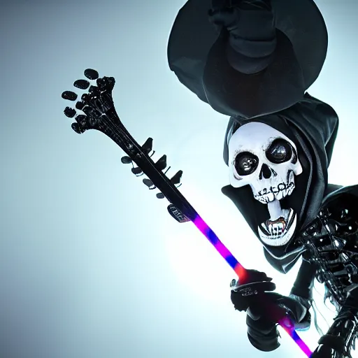 gothpunk Skeletor with laser eyes, playing electric guitar, smoke, lights, lasers, highly detailed, realistic, technology and magic, studio lighting, UHD
