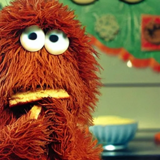 Prompt: The Cookie Monster is munching down on a horseradish, deleted scene from the show