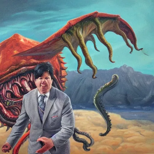 an oil painting of Michael mcintyre fighting cthulhu on mars