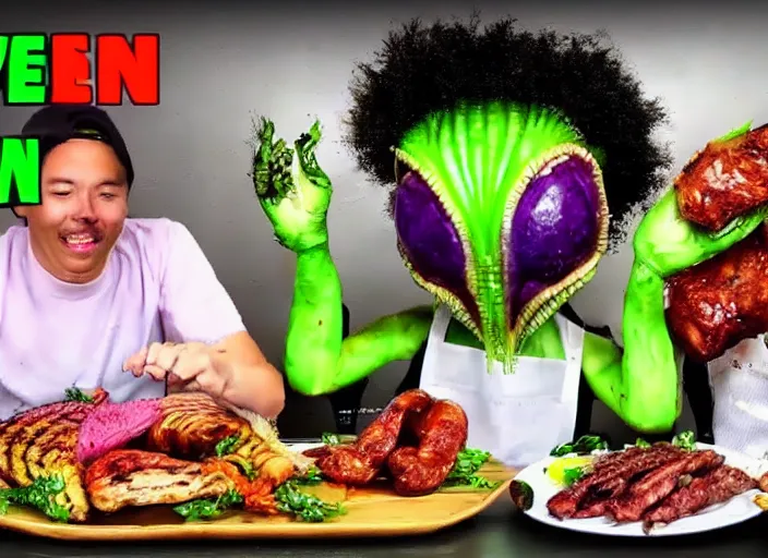 Alien mukbang on YouTube. Alien vegetables, roasted. Exotic meat, grilled. Trending on YouTube. HD