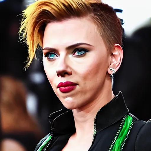Scarlett Johansson wearing black industrial cybergothic clothing with black hair with green streaks
