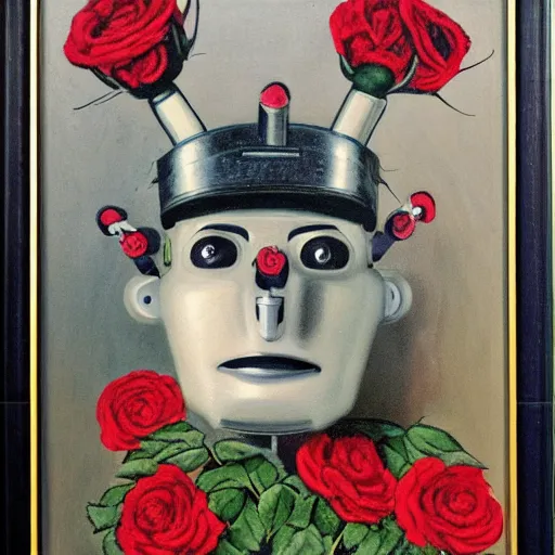 a portrait of a robot wearing a hat full of roses, by Otto Eerelman