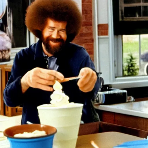Bob Ross painting an ice cream sundae, tv show, 90s, vintage, old-school, artist, brush,