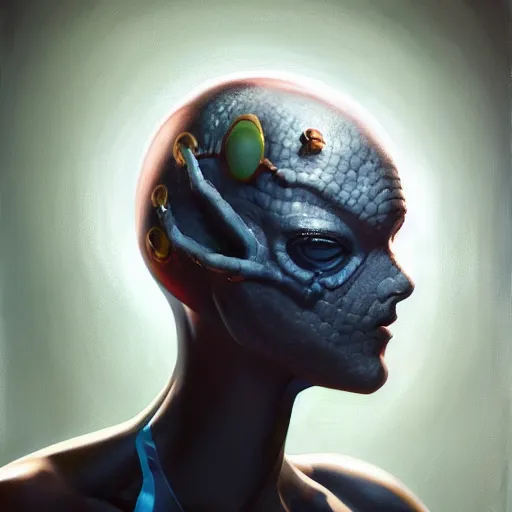 a realistic painting by Raffaello Sanzi depicting the girl with the head of the symbiotic Symbiot...Show more