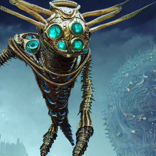 Otherworldly insectoid being with metallic skin, ornate, regal, 4k, xenobiologist art, concept art
