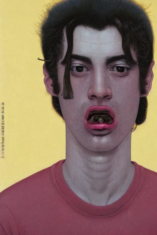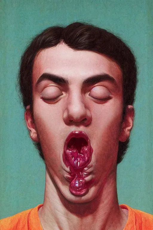 a closeup portrait of a young italian man licking a blotter paper of LSD acid on his tongue and d...Show more