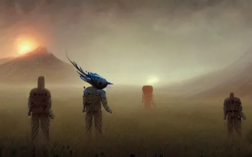 Mattepainting of a man in a space ranger unform surrounded large moths, digital illustration by Greg Rutkowski and Zdislav Beksinski
