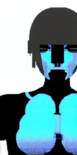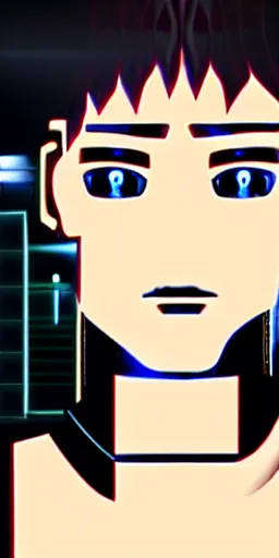 superior AI showing face on screen in tower of hardware, ghost in the shell style