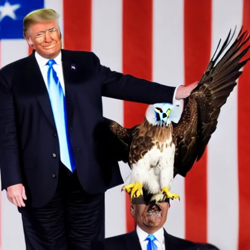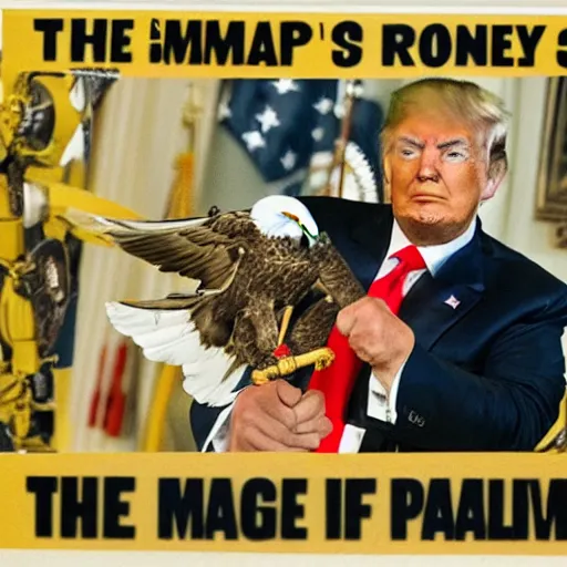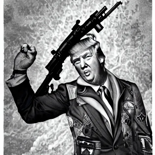 Donald Trump holds a machine gun with an eagle on his shoulder, hd, dramatic, patriotic