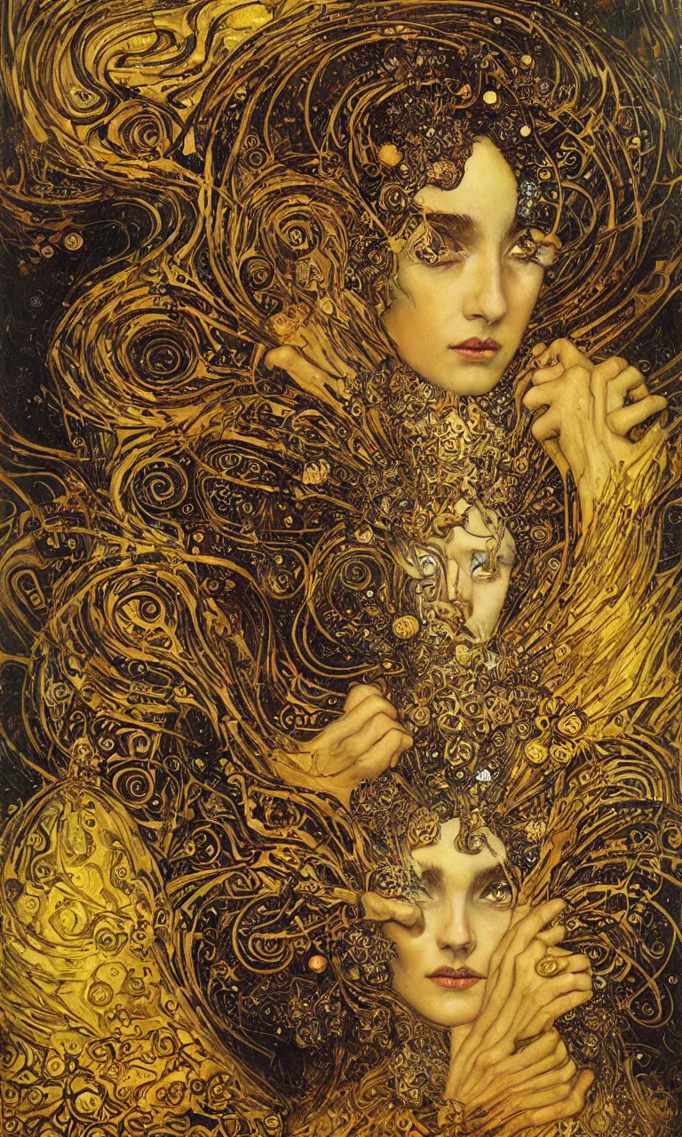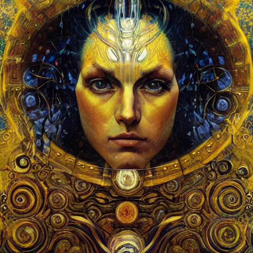 Divine Chaos Engine portrait by Karol Bak, Jean Deville, Gustav Klimt, and Vincent Van Gogh, sacred geometry, visionary, mystic, fractal structures, ornate gilded medieval icon, spirals