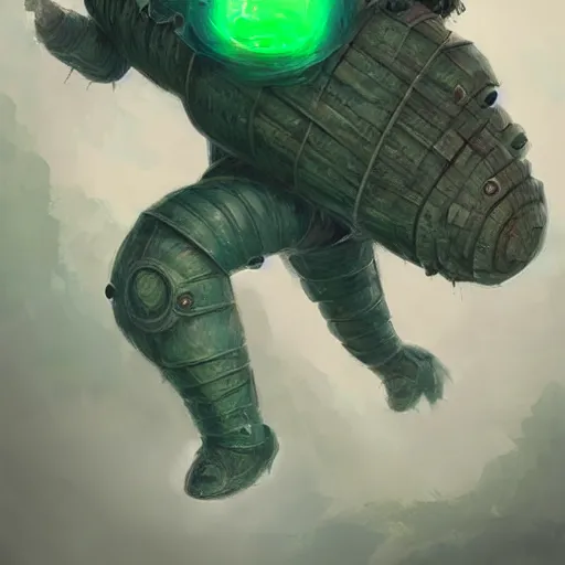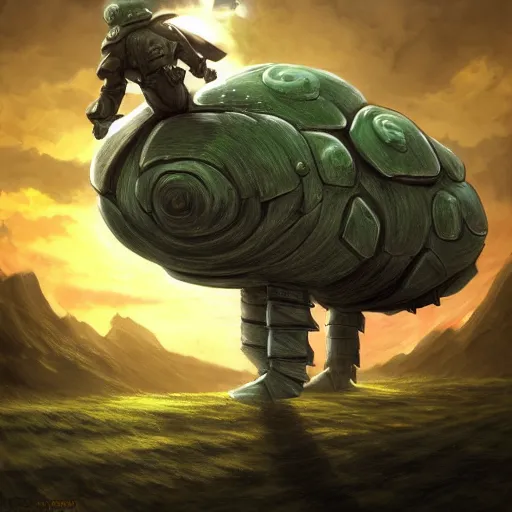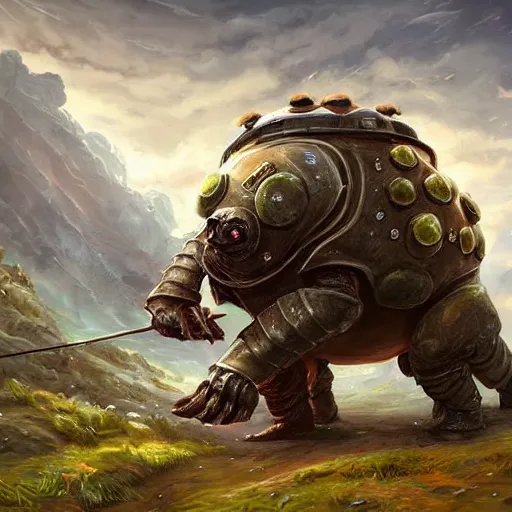A man in armour riding a giant tardigrade into battle, fantasy art, green hills, beautiful, trending on artstation, digital art